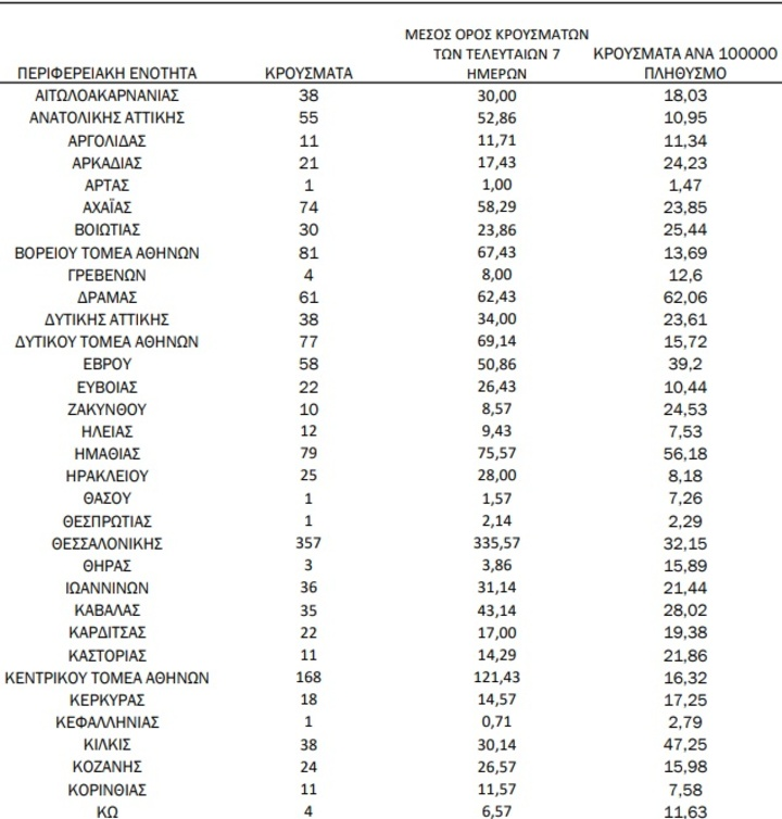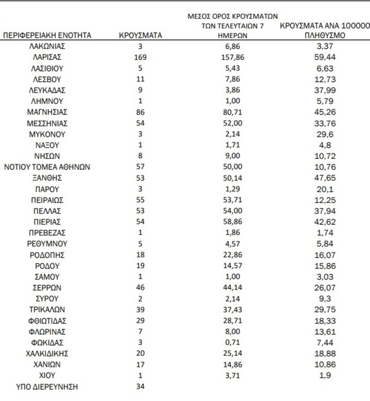 Με βάση τα επιβεβαιωμένα κρούσματα των τελευταίων 7 ημερών, 116 θεωρούνται σχετιζόμενα με ταξίδι από το εξωτερικό και 2.171 είναι σχετιζόμενα με ήδη γνωστό κρούσμα.