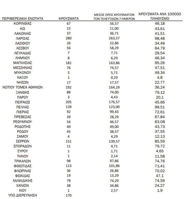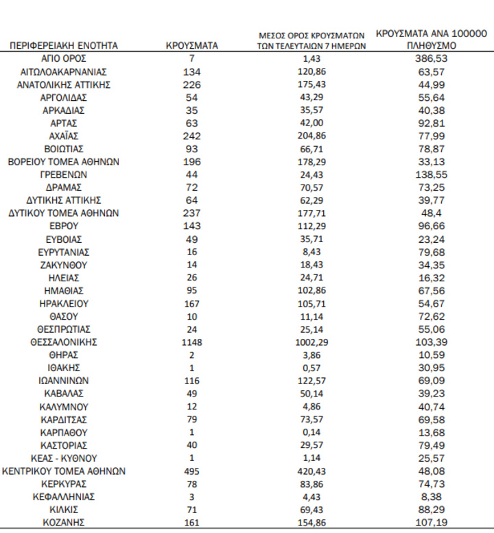 Με βάση τα επιβεβαιωμένα κρούσματα των τελευταίων 7 ημερών, 100 θεωρούνται σχετιζόμενα με ταξίδι από το εξωτερικό και 2.625 είναι σχετιζόμενα με ήδη γνωστό κρούσμα.