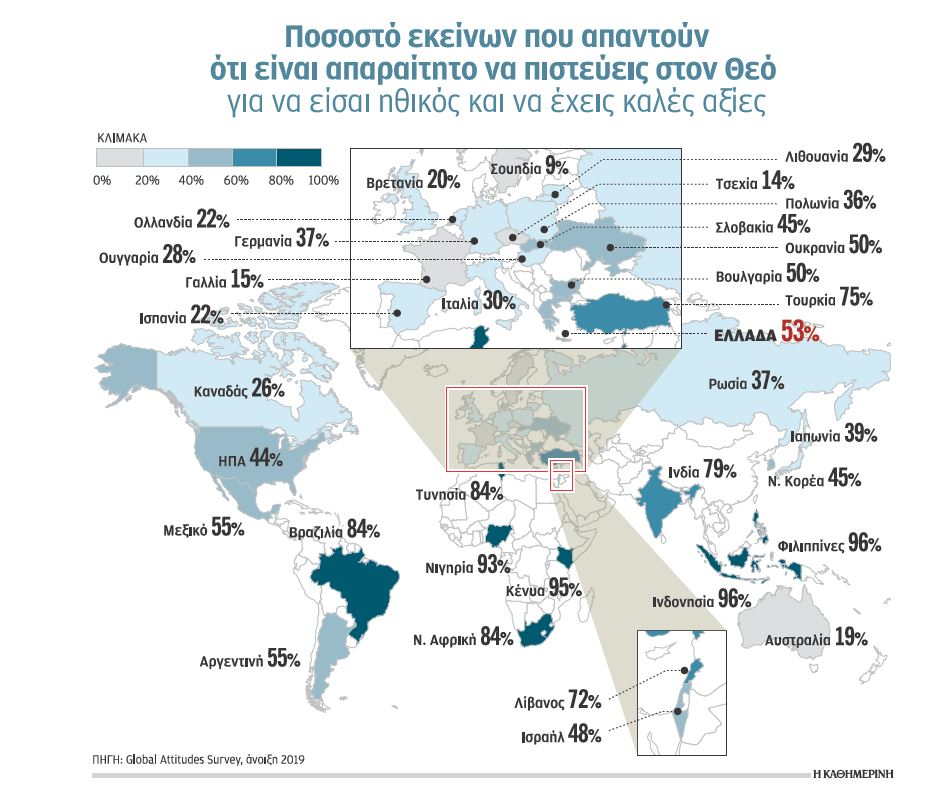 Το γενικό αποτέλεσμα της έρευνας είναι το εξής: Το 62% των πολιτών (στις 34 χώρες) απαντά ότι η θρησκεία παίζει σημαντικό ρόλο στη ζωή του. Το 61% απαντά ότι ο Θεός παίζει σημαντικό ρόλο στη ζωή του. Και το 53% ομολογεί ότι η προσευχή παίζει σημαντικό ρόλο στη ζωή του. Από τα 13 κράτη της Ε.Ε. στα οποία διενεργήθηκε η έρευνα, η Ελλάδα είναι πρώτη στην πεποίθηση ότι η πίστη στον Θεό είναι προϋπόθεση για να είσαι ηθικός (53%). Στη δεύτερη θέση βρίσκεται η Βουλγαρία (50%) και στην τρίτη η Σλοβακία (45%). Ενδεικτικά, η σύνδεση της ηθικής με την πίστη στον Θεό γίνεται από το 26% των Καναδών και το 44% των Αμερικανών. Στον αντίποδα βρίσκονται η Γαλλία (15%), η Τσεχία (14%) και η Σουηδία (9%). Βεβαίως, απέχουμε πολύ από την Ινδονησία και τις Φιλιππίνες όπου το 96% απαντά ότι η πίστη στον Θεό είναι ταυτόσημη με την ηθική. Λίγο πιο συγκρατημένοι είναι οι Ινδοί, αφού το ίδιο πιστεύουν «μόλις» οι 8 στους 10 (79%). Στην Τουρκία το ποσοστό είναι 75%, στη Βραζιλία 84% και στην Κένυα 95%. Αξίζει να σημειωθεί ότι το 2002 το ποσοστό στην Τουρκία ήταν 84% που σημαίνει ότι μέσα στα τελευταία 20 χρόνια ένας στους δέκα Τούρκους μετακινήθηκε «δυτικότερα». Παρ’ όλα αυτά η Ελλάδα και η Τουρκία είναι οι μόνες χώρες με ανεπτυγμένη οικονομία όπου έχουν τόσο μεγάλα ποσοστά σύνδεσης της πίστης στον Θεό με την ηθική.