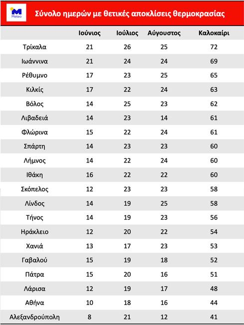 Διαπιστώθηκε ότι στους περισσότερους μετεωρολογικούς σταθμούς η θερμοκρασία φέτος ήταν υψηλότερη από τα φυσιολογικά για την εποχή επίπεδα περισσότερες από τις μισές ημέρες του καλοκαιριού. Στην «κορυφή» των αποκλίσεων βρέθηκαν τα Τρίκαλα Θεσσαλίας, όπου θετικές αποκλίσεις καταγράφηκαν κατά τις 72 από τις 92, συνολικά, ημέρες του καλοκαιριού, ενώ 69 ημέρες με θετικές αποκλίσεις καταγράφηκαν στα Ιωάννινα.