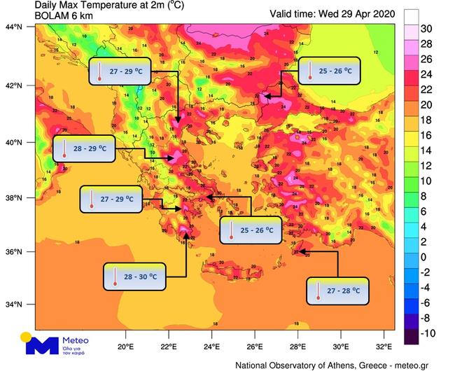Περαιτέρω άνοδο αναμένεται να σημειώσει η θερμοκρασία τις επόμενες ημέρες φτάνοντας κατά τόπους τους 27-29 βαθμούς Κελσίου, ενώ τις πρώτες ημέρες του Μαΐου οι μέγιστες θερμοκρασίες θα φτάσουν τους 30 βαθμούς Κελσίου, σύμφωνα με τα διαθέσιμα προγνωστικά στοιχεία του Εθνικού Αστεροσκοπείου Αθηνών-meteo. Στον προγνωστικό χάρτη που ακολουθεί αποτυπώνονται οι μέγιστες θερμοκρασίες που θα επικρατήσουν την Τετάρτη 29/04 ενώ επισημαίνονται ενδεικτικές τιμές σε διάφορες περιοχές της χώρας.