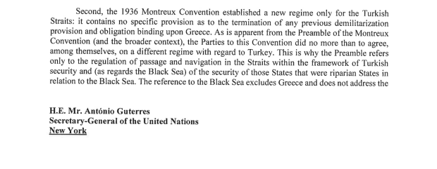 Στο τέλος της επιστολής του ο κ. Σινιρλίογλου σημειώνει ότι «η Τουρκία καλεί για ακόμα μία φορά την Ελλάδα να συμμορφωθεί με τις προβλέψεις αποστρατιωτικοποίησης»μιας σειράς συνθηκών «και να επαναφέρει το αποστρατιωτικοποιημένο καθεστώς των νησιών του Ανατολικού Αιγαίου, όπως ήταν πριν από την πραγματοποίηση των παραβιάσεων της Ελλάδας».