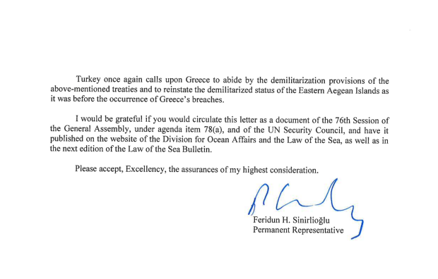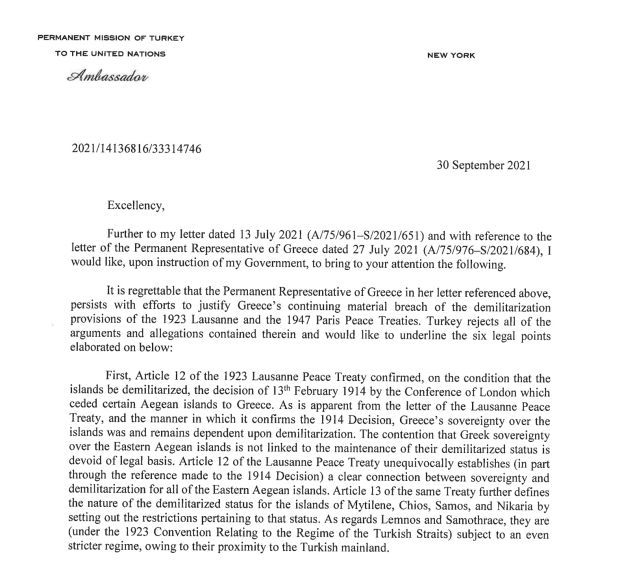 Επανάληψη των οξυμένης επιθετικότητας τουρκικών θέσεων περί σύνδεσης της κυριαρχίας επί των νησιών του Ανατολικού Αιγαίου με την αποστρατιωτικοποίησή τους αποτελεί η τελευταία επιστολή του μόνιμου αντιπροσώπου της Τουρκίας στον ΟΗΕ Φεριντούν Σινιρλίογλου. Αποτελεί απάντηση στην από 27ης Ιουλίου επιστολή της μόνιμης αντιπροσώπου της Ελλάδας στον ΟΗΕ Μαρίας Θεοφίλη, που τότε είχε απορρίψει με πλήρη επιχειρηματολογία το σύνολο των τουρκικών απόψεων, οι οποίες στόχευαν στην αμφισβήτηση της ελληνικής κυριαρχίας στο Ανατολικό Αιγαίο.