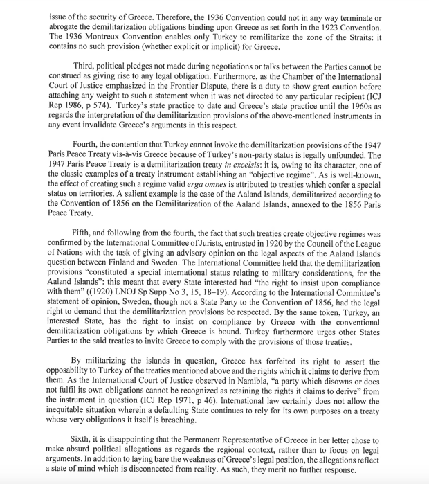 Το ολιγοσέλιδο κείμενο του κ. Σινιρλίογλου αποτελεί ένα συμπίλημα νομικών όρων και συνθηκών τις οποίες επικαλείται, ανάμεσα στις οποίες και το δικαίωμα της Σουηδίας να επιβάλει αποστρατιωτικοποίηση των νησιών Ολαντ, που βρίσκονται στο στόμιο του Βοθνικού Κόλπου αλλά ανήκουν στη Φινλανδία. «Κατά τον ίδιο τρόπο» σημειώνει ο Τούρκος διπλωμάτης, «η Τουρκία, ένα ενδιαφερόμενο κράτος, έχει το δικαίωμα να επιμείνει στη συμμόρφωση από την Ελλάδα με τις συμβατικές υποχρεώσεις αποστρατιωτικοποίησης με τις οποίες η Ελλάδα είναι δεσμευμένη» Σε μία ακόμη νομικίστικη ερμηνεία, ο κ. Σινιρλίογλου υποστηρίζει ότι η Ελλάδα έχοντας στρατιωτικοποιήσει τα νησιά «έχει χάσει το δικαίωμα να διεκδικεί την αντίθεση»σε μια σειρά από συνθήκες «και τα δικαιώματα που ισχυρίζεται ότι πηγάζουν από αυτές»