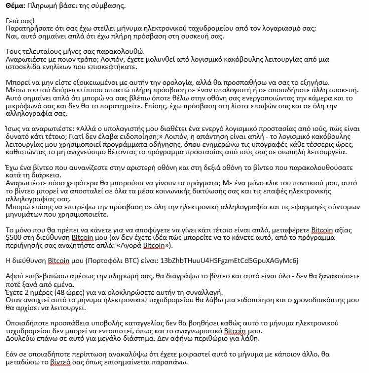 Άγνωστοι με τη χρήση ψεύτικων λογαριασμών ηλεκτρονικού ταχυδρομείου στέλνουν τα μηνύματα και ενημερώνουν ότι διαθέτουν πρόσβαση στη συσκευή των αποδεκτών και το μήνυμα έχει αποσταλεί από τον προσωπικό τους λογαριασμό.