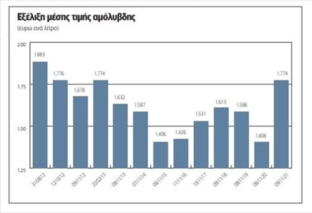 Σύμφωνα με τα στοιχεία του παρατηρητηρίου τιμών υγρών καυσίμων του υπουργείου Ανάπτυξης και Επενδύσεων, η τελευταία φορά που καταγράφηκε μέση πανελλαδική τιμή στην αμόλυβδη πάνω από το 1,774 που σημειώθηκε προχθές 9 Νοεμβρίου, ήταν στις 12 Οκτωβρίου 2012, όπου η μέση τιμή διαμορφώθηκε στο 1,776 ευρώ ανά λίτρο. Ωστόσο, τότε η τιμή του μπρεντ ήταν στα περίπου 110 – 112 δολάρια το βαρέλι.