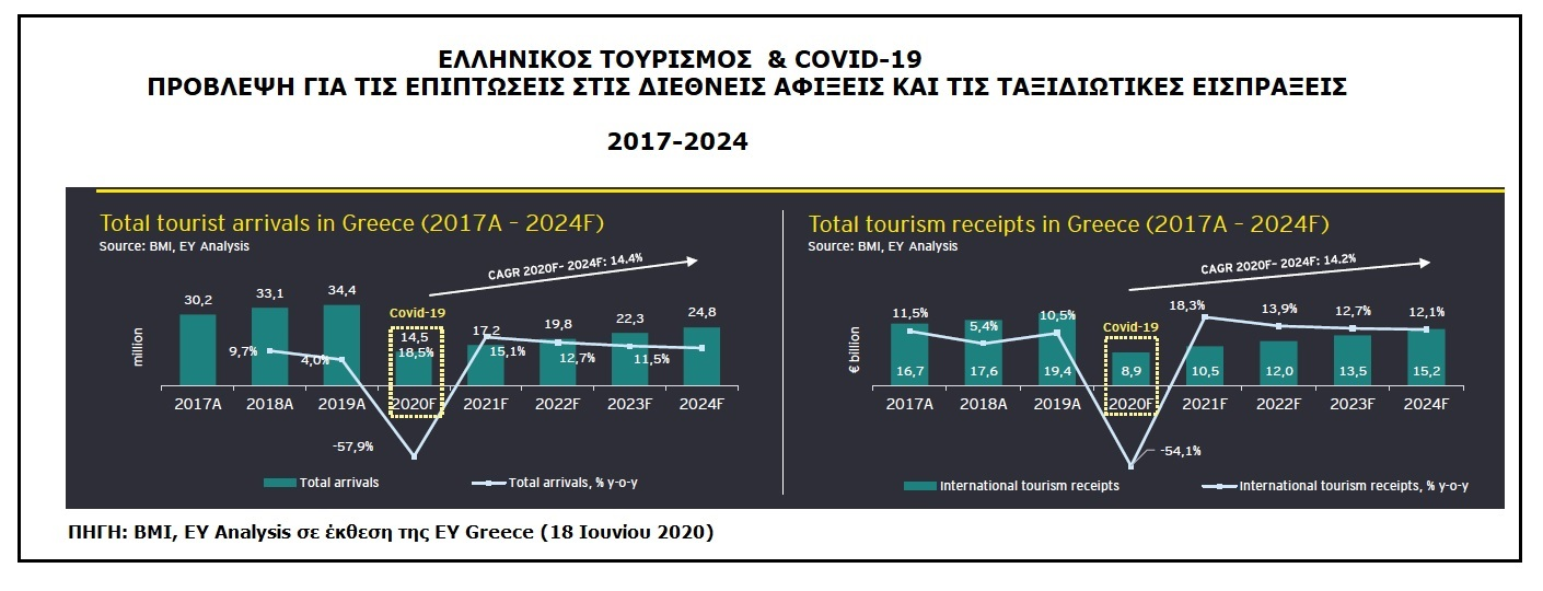 Σε έκθεση της EY Ελλάδας η οποία βασίζεται σε στοιχεία και εκτιμήσεις που είχαν δημοσιοποιηθεί από διάφορους φορείς (UNWTO, WTTC, STR, BMI) μέχρι τις 15 Ιουνίου 2020, συμπεριλαμβάνεται μεταξύ άλλων η εκτίμηση πως οι αφίξεις και οι ταξιδιωτικές εισπράξεις στην Ελλάδα δεν προβλέπεται να επανέλθουν στα προ Covid -19 επίπεδα κατά τη διάρκεια της περιόδου 2021-2024. Τα δεδομένα προέρχονται από την BMI και την EY Analysis.