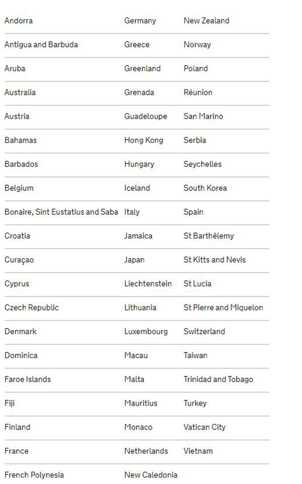 Αναλυτικά η «λευκή λίστα» των χωρών που εξαιρούνται της καραντίνας, την οποία έδωσε στη δημοσιότητα η βρετανική κυβέρνηση: