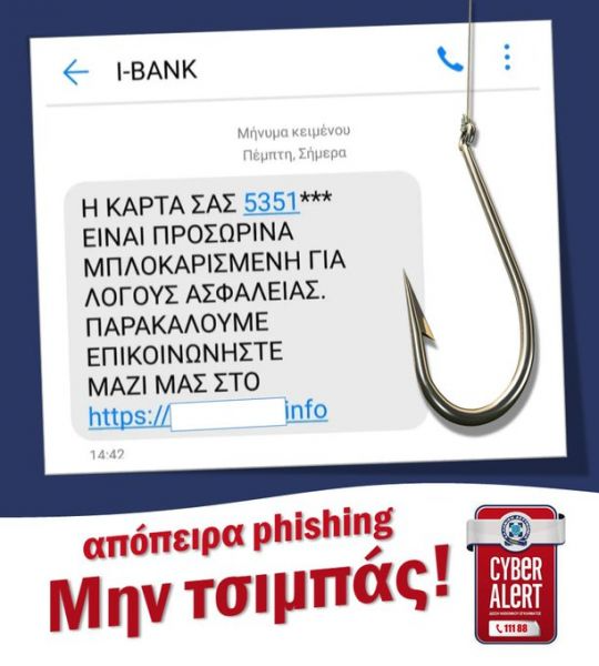 Η Δίωξη Ηλεκτρονικού Εγκλήματος σε μήνυμά της επισημαίνει: «Μην τσιμπάς! Απόπειρα #phishing. Κάποιος επιδιώκει να υποκλέψει τους κωδικούς πρόσβασης στο web banking σου κι έπειτα να σου αφαιρέσει χρήματα. Για βοήθεια, επικοινώνησε με την τράπεζά σου ή με τη ΔΙ.Δ.Η.Ε. στο 11188».