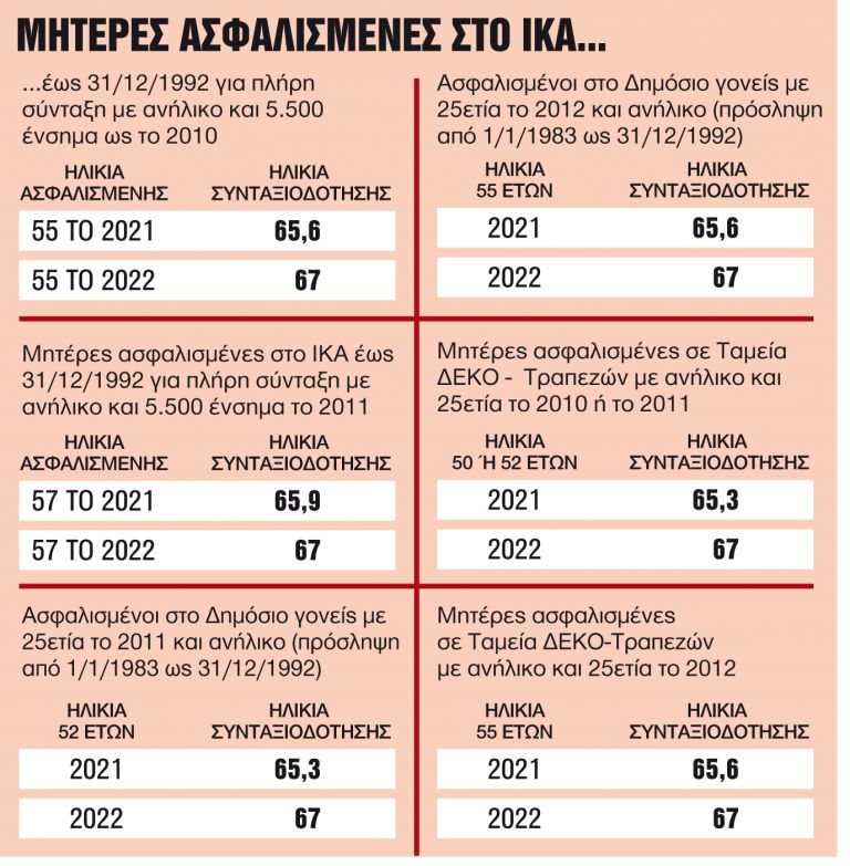Η μητέρα που έχει ελπίδες μετά την αύξηση των ορίων ηλικίας να συνταξιοδοτηθεί νωρίτερα λόγω ανηλίκου, θα πρέπει να έχει ηλικία που να επιτρέπει να συμπληρώσει το απαιτούμενο νέο όριο ηλικίας συνταξιοδότησης εγκαίρως, δηλαδή εντός του μεταβατικού σταδίου που θέτει ο νέος νόμος και σίγουρα μέχρι το 2021.