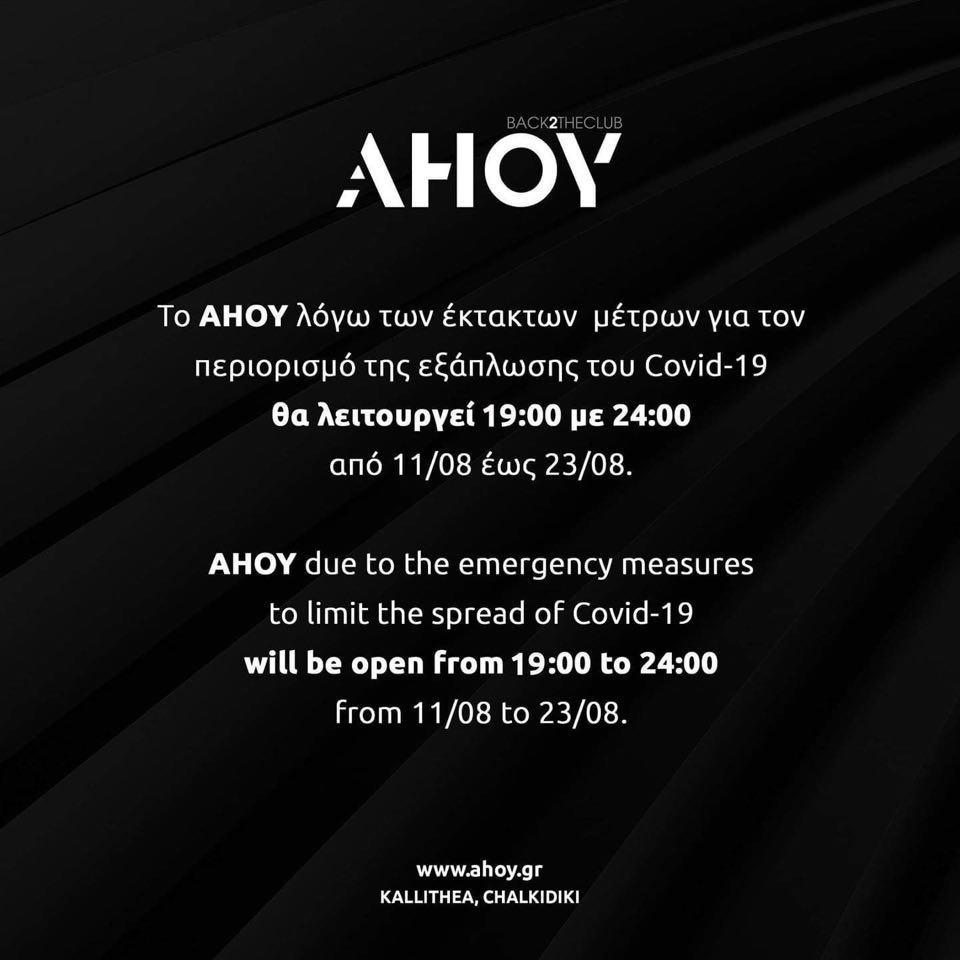 Νέα ωράρια λειτουργίας εφαρμόζουν και κλαμπ στη Χαλκιδική, σε μια προσπάθεια να σώσουν ό,τι σώζεται από τη σεζόν ενόψει και του Δεκαπενταύγουστου. Το παλαιότερο Club της Χαλκιδικής, το AHOY, ενημέρωσε ήδη το κοινό του ότι θα λειτουργεί από τις 19.00 έως και τα μεσάνυχτα. Το τροποποιημένο ωράριο εφαρμόζεται από σήμερα μέχρι και τις 23 Αυγούστου, περίοδο κατά την οποία θα ισχύουν τα έκτακτα μέτρα προστασίας από τον κορωνοϊό.