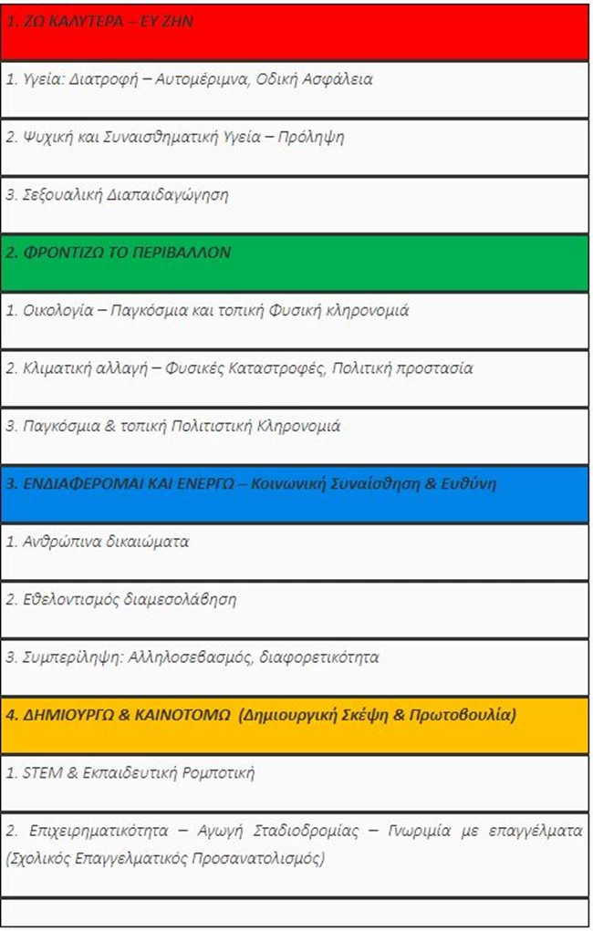 Μετά την επιτυχή πιλοτική εφαρμογή των Εργαστηρίων Δεξιοτήτων φέτος σε 218 Νηπιαγωγεία, Δημοτικά και Γυμνάσια, το προσεχές σχολικό έτος προγραμματίζεται η διδασκαλία τους σε όλα τα σχολεία της χώρας. Τα Εργαστήρια Δεξιοτήτων περιλαμβάνουν τέσσερις θεματικούς κύκλους, με υπο-θεματικές σταθμισμένες ανά ηλικία και εκπαιδευτική βαθμίδα: