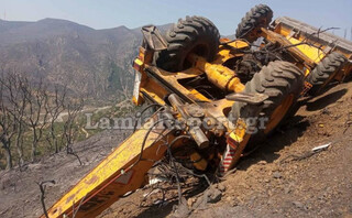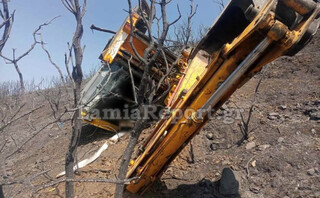 Η μπουλντόζα μετά την εκτροπή τούμπαρε και σταμάτησε όπως το βλέπετε στις φωτογραφίες του στη μέση της πλαγιάς, μετά από τριάντα μέτρα περίπου.