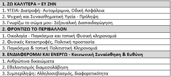 Το πρόγραμμα και το εκπαιδευτικό υλικό των «Εργαστηρίων Δεξιοτήτων» ομαδοποιείται σε τέσσερις Θεματικές Ενότητες, οι οποίες προκύπτουν από τους Παγκόσμιους Δείκτες Αειφόρου Ανάπτυξης (περιβάλλον, ευ ζην, ασφάλεια, κοινωνία των πολιτών, σύγχρονη τεχνολογία και επιχειρηματικότητα) και προσαρμόζεται ανά ηλικία. Ειδικότερα, οι θεματικές είναι οι εξής: