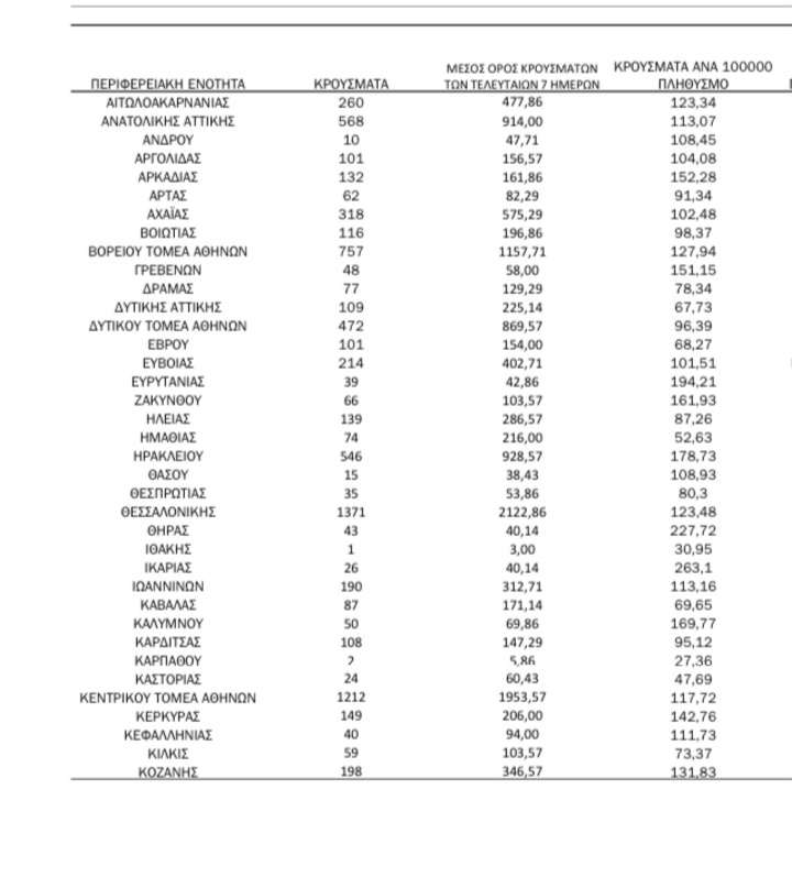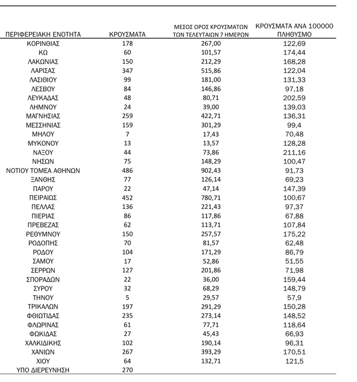 Τα νέα εργαστηριακά επιβεβαιωμένα κρούσματα της νόσου που καταγράφηκαν τις τελευταίες 24 ώρες είναι 12.462 , εκ των οποίων 24 εντοπίστηκαν κατόπιν ελέγχων στις πύλες εισόδου της χώρας. Ο συνολικός αριθμός των κρουσμάτων ανέρχεται σε 2.788.654 (ημερήσια μεταβολή +0.4%), εκ των οποίων 49.3% άνδρες. Με βάση τα επιβεβαιωμένα κρούσματα των τελευταίων 7 ημερών, 177 θεωρούνται σχετιζόμενα με ταξίδι από το εξωτερικό και 1.685 είναι σχετιζόμενα με ήδη γνωστό κρούσμα.