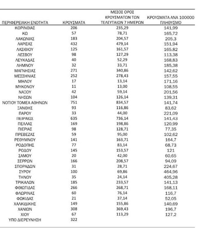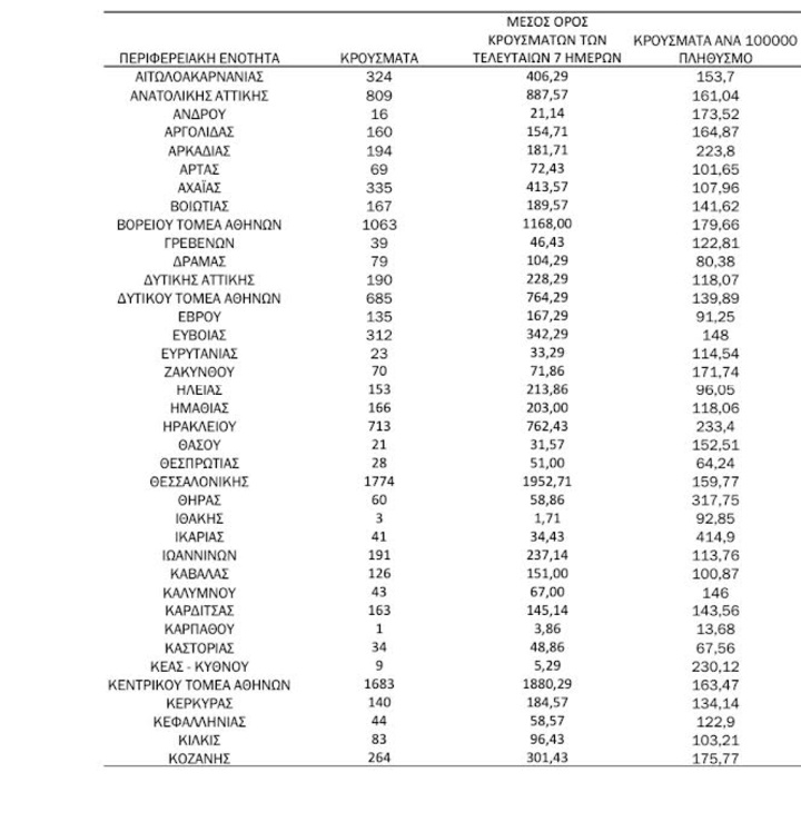 Με βάση τα επιβεβαιωμένα κρούσματα των τελευταίων 7 ημερών, 173 θεωρούνται σχετιζόμενα με ταξίδι από το εξωτερικό και 1.281 είναι σχετιζόμενα με ήδη γνωστό κρούσμα.