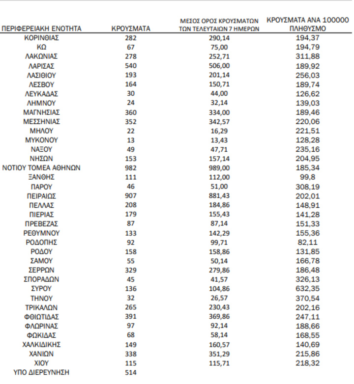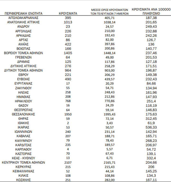 Ο συνολικός αριθμός των κρουσμάτων ανέρχεται σε 3.051.531 (ημερήσια μεταβολή +0.7%), εκ των οποίων 49.1% άνδρες. Με βάση τα επιβεβαιωμένα κρούσματα των τελευταίων 7 ημερών, 181 θεωρούνται σχετιζόμενα με ταξίδι από το εξωτερικό και 1.778 είναι σχετιζόμενα με ήδη γνωστό κρούσμα.