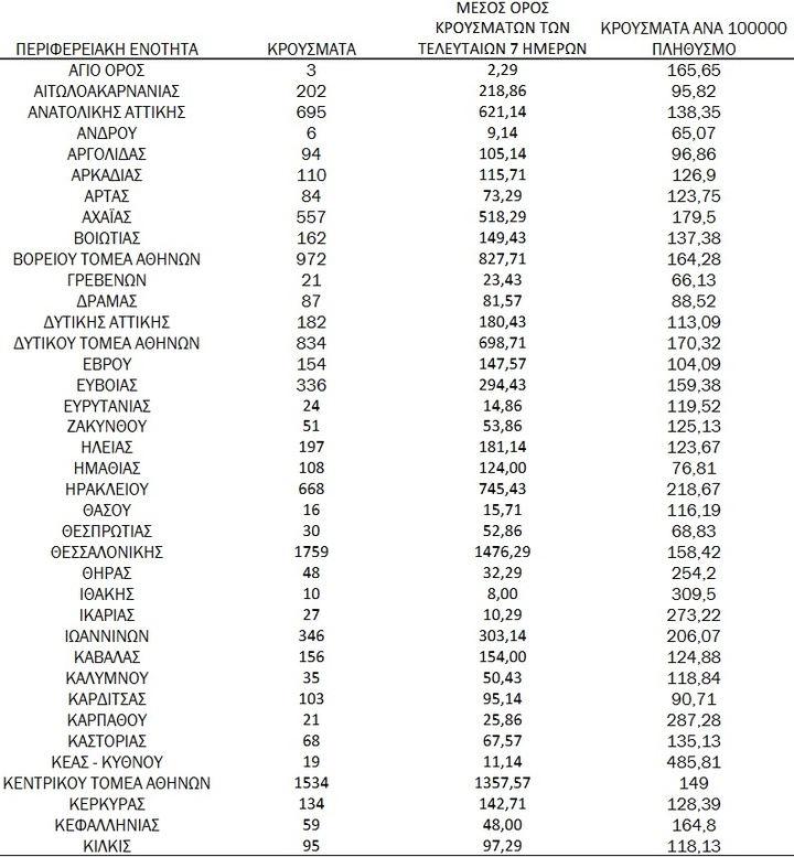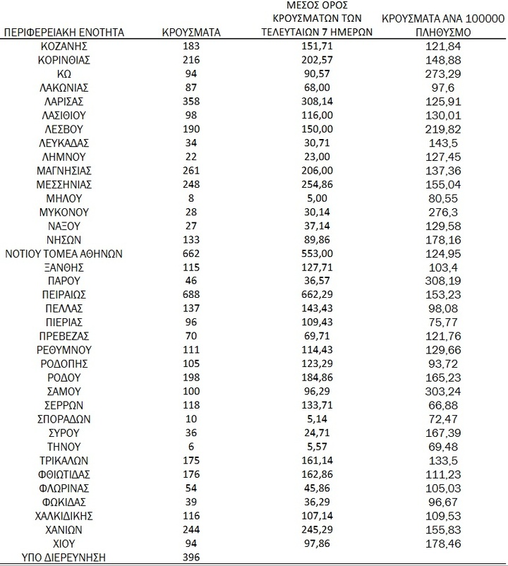 Με βάση τα επιβεβαιωμένα κρούσματα των τελευταίων 7 ημερών, 286 θεωρούνται σχετιζόμενα με ταξίδι από το εξωτερικό και 2.163 είναι σχετιζόμενα με ήδη γνωστό κρούσμα.