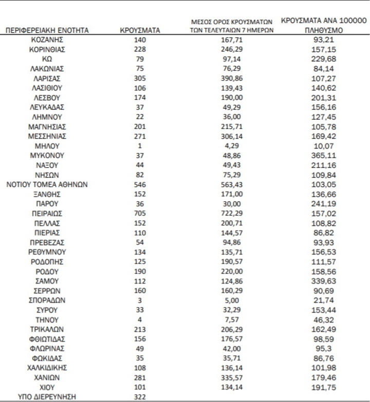 Με βάση τα επιβεβαιωμένα κρούσματα των τελευταίων 7 ημερών, 313 θεωρούνται σχετιζόμενα με ταξίδι από το εξωτερικό και 2.232 είναι σχετιζόμενα με ήδη γνωστό κρούσμα.