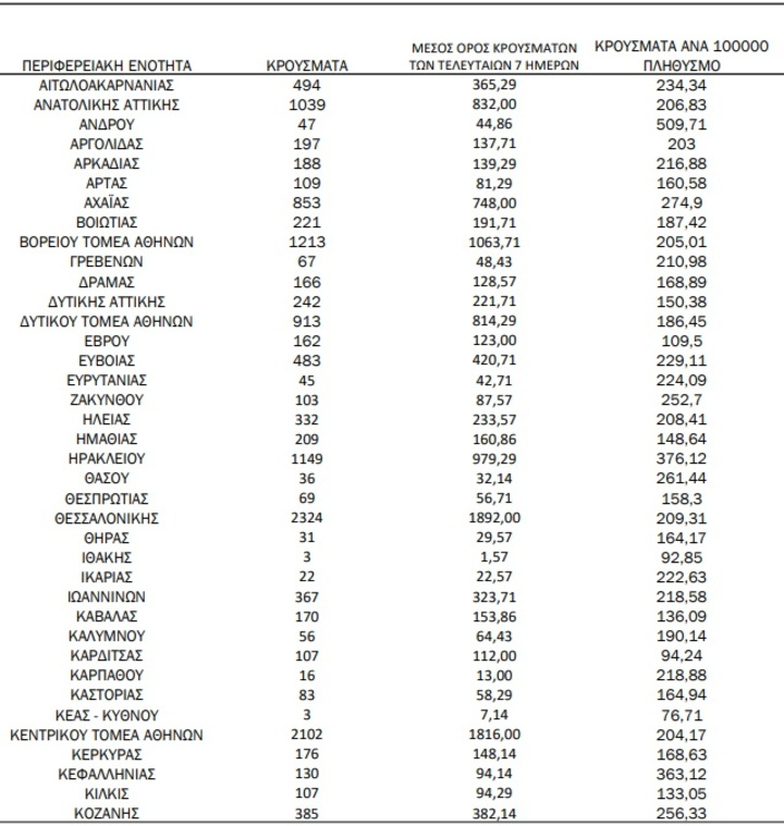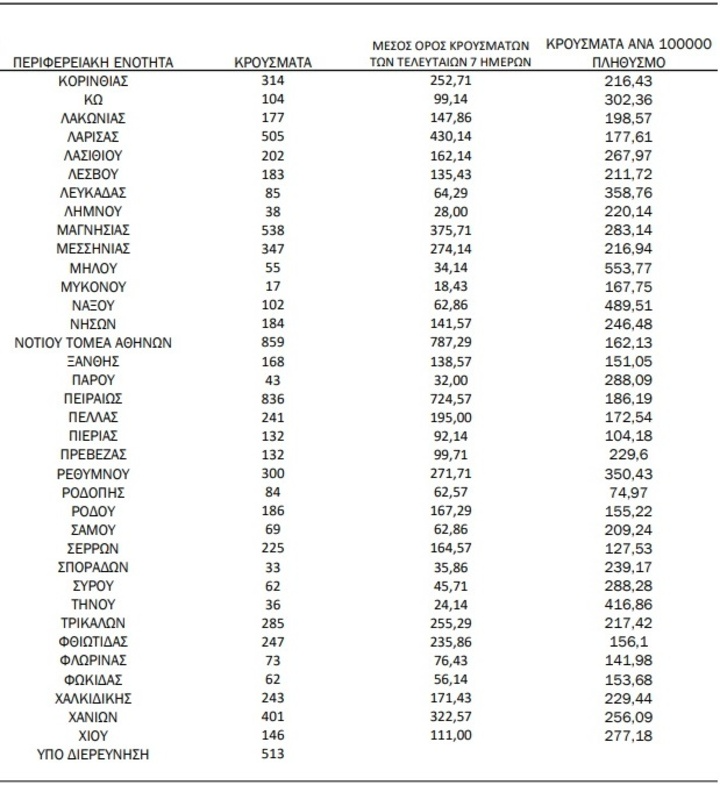 Με βάση τα επιβεβαιωμένα κρούσματα των τελευταίων 7 ημερών, 219 θεωρούνται σχετιζόμενα με ταξίδι από το εξωτερικό και 1.383 είναι σχετιζόμενα με ήδη γνωστό κρούσμα.
