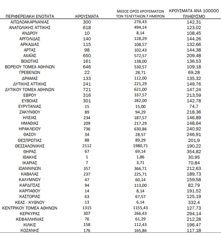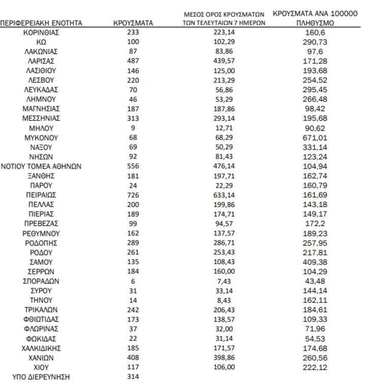 Με βάση τα επιβεβαιωμένα κρούσματα των τελευταίων 7 ημερών, 383 θεωρούνται σχετιζόμενα με ταξίδι από το εξωτερικό και 2.520 είναι σχετιζόμενα με ήδη γνωστό κρούσμα.