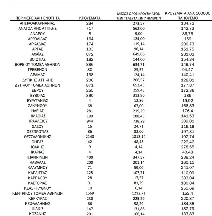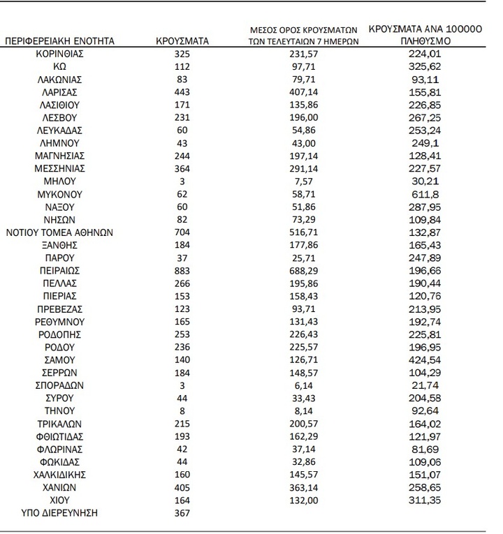 Ο συνολικός αριθμός των κρουσμάτων ανέρχεται σε 2.235.920 (ημερήσια μεταβολή +0.9%), εκ των οποίων 49.7% άνδρες. Με βάση τα επιβεβαιωμένα κρούσματα των τελευταίων 7 ημερών, 373 θεωρούνται σχετιζόμενα με ταξίδι από το εξωτερικό και 2.186 είναι σχετιζόμενα με ήδη γνωστό κρούσμα.