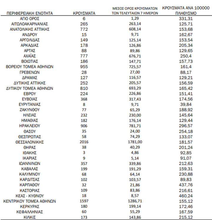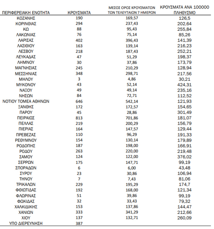 Με βάση τα επιβεβαιωμένα κρούσματα των τελευταίων 7 ημερών, 339 θεωρούνται σχετιζόμενα με ταξίδι από το εξωτερικό και 2.213 είναι σχετιζόμενα με ήδη γνωστό κρούσμα.