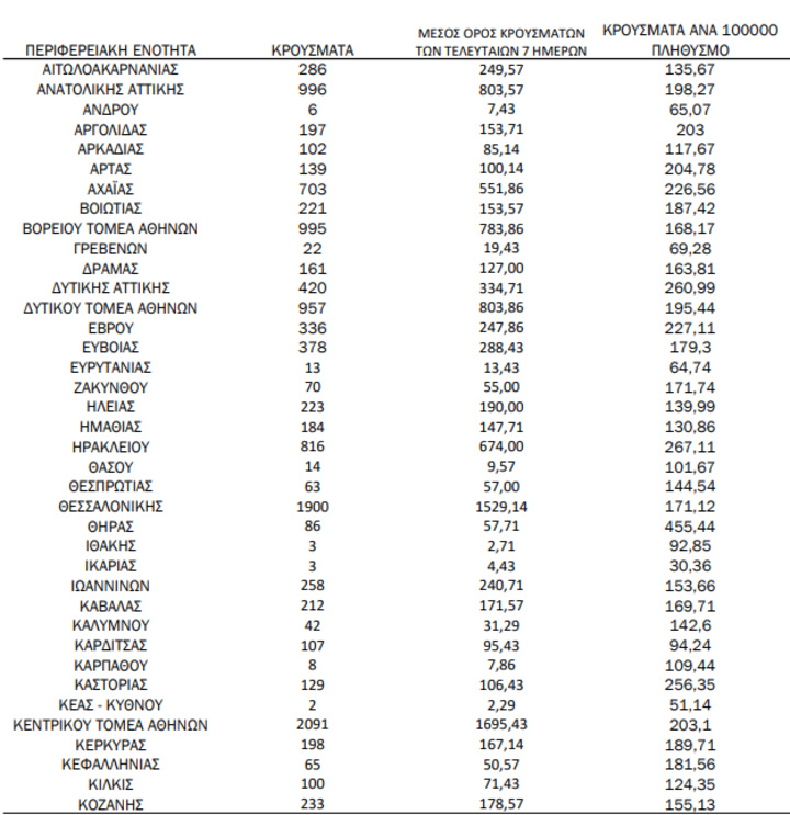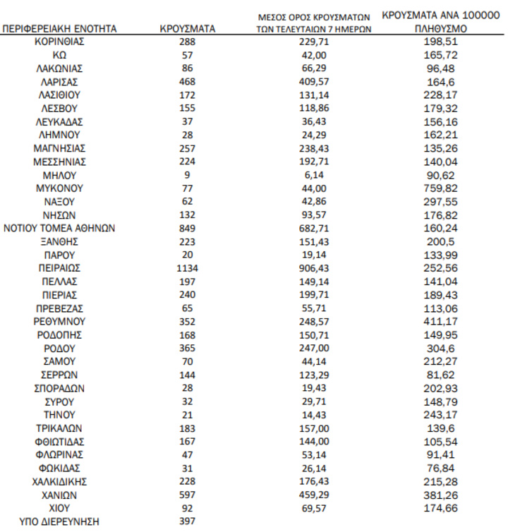 Με βάση τα επιβεβαιωμένα κρούσματα των τελευταίων 7 ημερών, 433 θεωρούνται σχετιζόμενα με ταξίδι από το εξωτερικό και 2.643 είναι σχετιζόμενα με ήδη γνωστό κρούσμα.