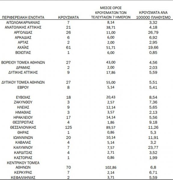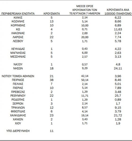 Με βάση τα επιβεβαιωμένα κρούσματα των τελευταίων 7 ημερών, 52 θεωρούνται σχετιζόμενα με ταξίδι από το εξωτερικό και 1558 είναι σχετιζόμενα με ήδη γνωστό κρούσμα.