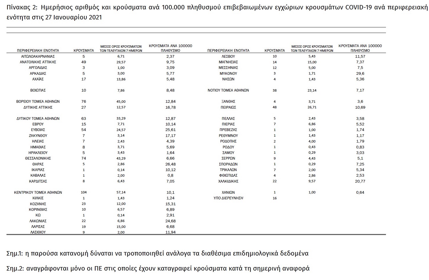Τέλος, έχουμε 32 νέους θανάτους από τη νόσο COVID-19, φθάνοντας τους 5724 θανάτους συνολικά στη χώρα, εκ των οποίων 3367 (58.8%) άνδρες. Η διάμεση ηλικία των θανόντων συμπολιτών μας ήταν τα 79 έτη και το 95.4% είχε κάποιο υποκείμενο νόσημα ή/και ηλικία 70 ετών και άνω.