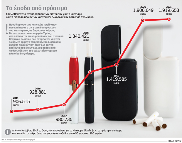 Το 2021 τα έσοδα από τα πρόστιμα που επιβλήθηκαν για παραβάσεις των διατάξεων για το κάπνισμα αλλά και των διατάξεων για τη διάθεση προϊόντων καπνού και αλκοολούχων ποτών σε ανηλίκους άγγιξαν το 1.920.000 ευρώ, ενώ αντίστοιχο ποσό εισπράχθηκε και το 2020 (1.907.000 ευρώ). Μικρότερα ποσά εισπράχθηκαν τα προηγούμενα έτη (1.420.000 ευρώ το 2019, 1.340.500 ευρώ το 2018 και 980.735 ευρώ το 2017), ωστόσο αξίζει να σημειωθεί ότι τον Νοέμβριο του 2019 «ξανάρχισε» με νέο θεσμικό πλαίσιο, πιο «τσουχτερά πρόστιμα» και περισσότερους ελέγχους η αντικαπνιστική νομοθεσία.