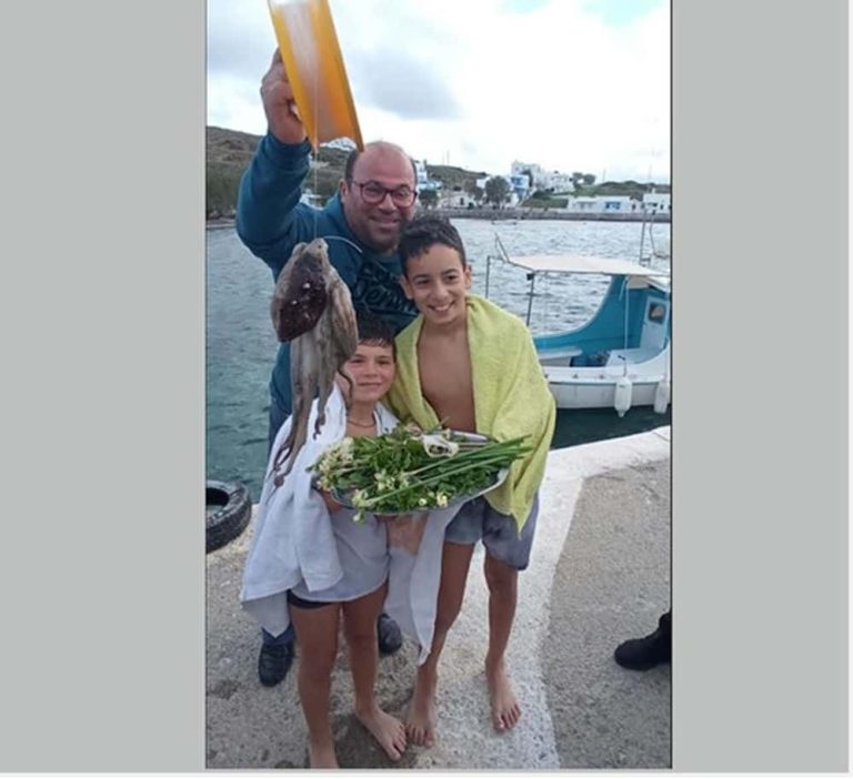 Δύο μικρά παιδιά ο Σπύρος Κιουκας και ο Νικόλας Σισώης πιάσανε τον σταυρό μαζί και μόλις πήγανε να βγούνε έξω, ξαφνικά στον Νικόλα γατζώθηκε πάνω του ένα μεγάλο χταπόδι .