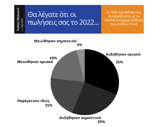 Συγκεκριμένα, όπως προκύπτει από σχετική έρευνα του GLAMI.gr, το 56% των συνεργαζόμενων ηλεκτρονικών καταστημάτων ανέφερε αύξηση των εσόδων του (συγκριτικά με το 47% στην αντίστοιχη ερώτηση της προηγούμενης χρονιάς). Μάλιστα, σε ποσοστό 43% έκρινε θετικά το 2022 ως προς τα επιχειρηματικά αποτελέσματα.