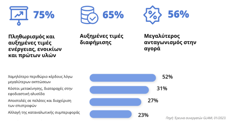 Ο πληθωρισμός ήταν η «νούμερο 1» πρόκληση για τα ηλεκτρονικά καταστήματα μόδας, με το αυξημένο κόστος διαφήμισης και τον μεγαλύτερο ανταγωνισμό να ακολουθούν αμέσως μετά, σύμφωνα με την ετήσια ανασκόπηση της Ελληνικής Αγοράς Μόδας. Η δέσμευση για βιώσιμες πρακτικές και η προσαρμογή στις νομοθετικές αλλαγές βρίσκονται στις τελευταίες προτεραιότητες των επιχειρήσεων.