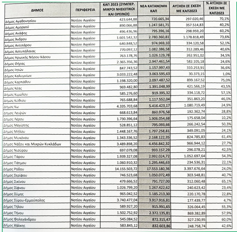 Στο Δήμο της Ρόδου, προκύπτει αύξηση κατά 24% από τα 14.155.503,72 ευρώ που ίσχυε μέχρι το 2023 σε 17.553.180,35 δηλαδή αύξηση 3.397.676,64 ενώ πχ στο Δήμο Καρπάθου η αύξηση φτάνει στο 75%.