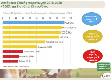 Σύμφωνα με τη μελέτη σε 3 προϊόντα ζωικής παραγωγής η Ελλάδα έχει πολύ χαμηλό βαθμό επάρκειας, δηλαδή κάτω του 50% και στηρίζεται κατά βάση σε εισαγωγές από άλλες χώρες: