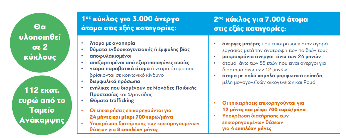 - 3.000 ανέργους που ανήκουν σε ειδικές και ευάλωτες κοινωνικές ομάδες (π.χ. άτομα με αναπηρία, απεξαρτημένοι, θύματα έμφυλης βίας ή εμπορίας ανθρώπων κ.ά.). Το πρόγραμμα θα χρηματοδοτεί έως και το 75% του μισθού και των εισφορών για 24 μήνες με υποχρέωση διατήρησης της θέσης για 8 μήνες. Η μέγιστη επιχορήγηση ανέρχεται σε 16.800 ευρώ ανά θέση εργασίας.