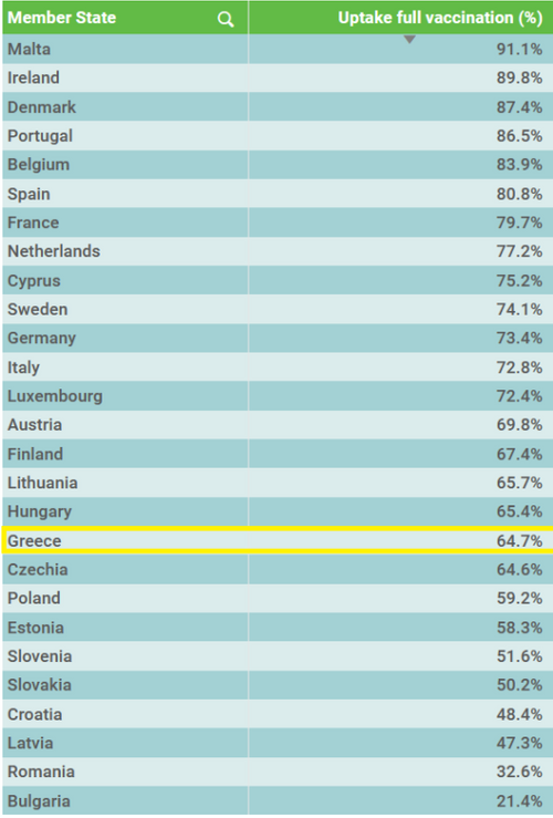 Η εμβολιαστική επίδοση της Ελλάδας (64,7%), σύμφωνα πάντα με τα στοιχεία του ECDC, την κατατάσσει στην 18η θέση ενώ την 19η καταλαμβάνει η Τσεχία με το 64,6% του πληθυσμού της να είναι πλήρως εμβολιασμένο.