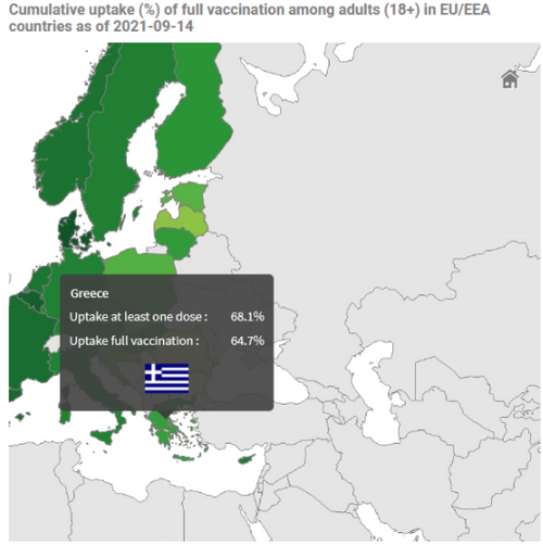 Στην 18η θέση μεταξύ των 27 κρατών-μελών της Ευρωπαϊκής Ενωσης βρίσκεται η Ελλάδα αναφορικά με το ποσοστό των πλήρως εμβολιασμένων ενήλικων πολιτών της. Σύμφωνα με τα στατιστικά στοιχεία του Ευρωπαϊκού Κέντρου Πρόληψης και Ελέγχου Νόσων (ECDC) στα μέσα Σεπτεμβρίου η πλήρης εμβολιαστική κάλυψη του ενήλικου πληθυσμού φθάνει το 64,7%.