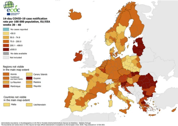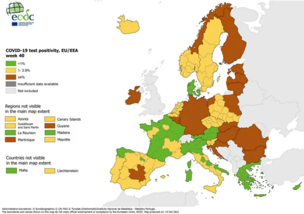 Με όλα τα χρώματα με τα οποία σημαίνεται ο βαθμός επικινδυνότητας της πανδημίας κορονοϊού, είναι χρωματισμένος ο χάρτης της Ελλάδας, σύμφωνα με τα επικαιροποιημένα στοιχεία της επιδημιολογικής εικόνας της χώρας, που παρουσίασε σήμερα 14 Οκτωβρίου το Ευρωπαϊκό Κέντρο Πρόληψης και Ελέγχου Νόσων (ECDC).