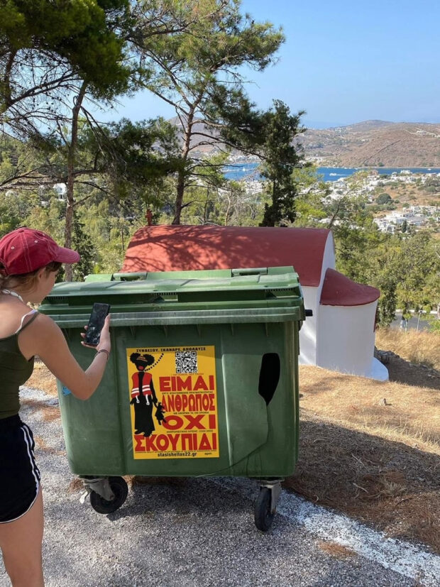 Σίγουρα λοιπόν παρατηρήσατε τους περαστικούς σε Πάτμο, Αστυπάλαια, Κάλυμνο, Λέρο να στέκονται μπροστά στα σκουπίδια και να σκανάρουν την αφίσα με τα κινητά τους. Πρόκειται για ένα πρωτότυπο installation της street art καλλιτέχνιδας Ελλάδας Στασινόγλου η οποία με αυτό το τρόπο προσπαθεί να μιλήσει για την ανθρωπιστική κρίση που ταλανίζει την εποχή μας.