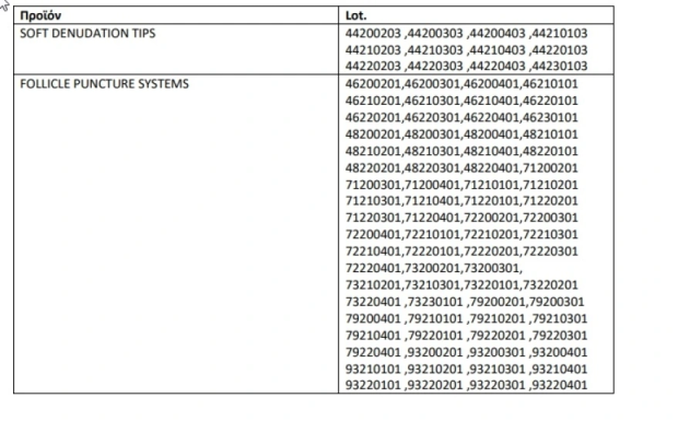 Παράλληλα, ο ΕΟΦ αποφάσισε την ανάκληση των παρτίδων του παρακάτω πίνακα των ιατροτεχνολογικών προϊόντων Κατηγορίας MDD Class IIa, SOFT DENUDATION TIPS + FOLLICLE PUNCTURE SYSTEMS λόγω του ότι κατά την διάρκεια της αξιολόγησης του κινδύνου, η ασφάλεια των προϊόντων δεν μπορεί να επιβεβαιωθεί αποδεδειγμένα, ιδίως όσον αφορά την εμβρυοτοξικότητα.