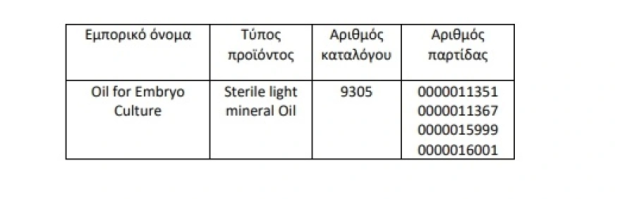 Ειδικότερα, ο Εθνικός Οργανισμός Φαρμάκων ανακοίνωσε την ανάκληση παρτίδων των ιατροτεχνολογικών προϊόντων του παρακάτω πίνακα μετά από ενημέρωση της κατασκευάστριας εταιρείας FUJIFILM Irvine Scientific Inc καθώς ανιχνεύτηκε τοξικότητα του λαδιού της καλλιέργειας που μπορεί να προκαλέσει βλάβη στην ανάπτυξη του εμβρύου και ανεπαρκή ανάπτυξη βλαστοκύστης ή μη μεταβιβάσιμη βλαστοκύστη με αποτέλεσμα στην αδυναμία διενέργειας της διαδικασίας με το εξασθενημένο έμβρυο.