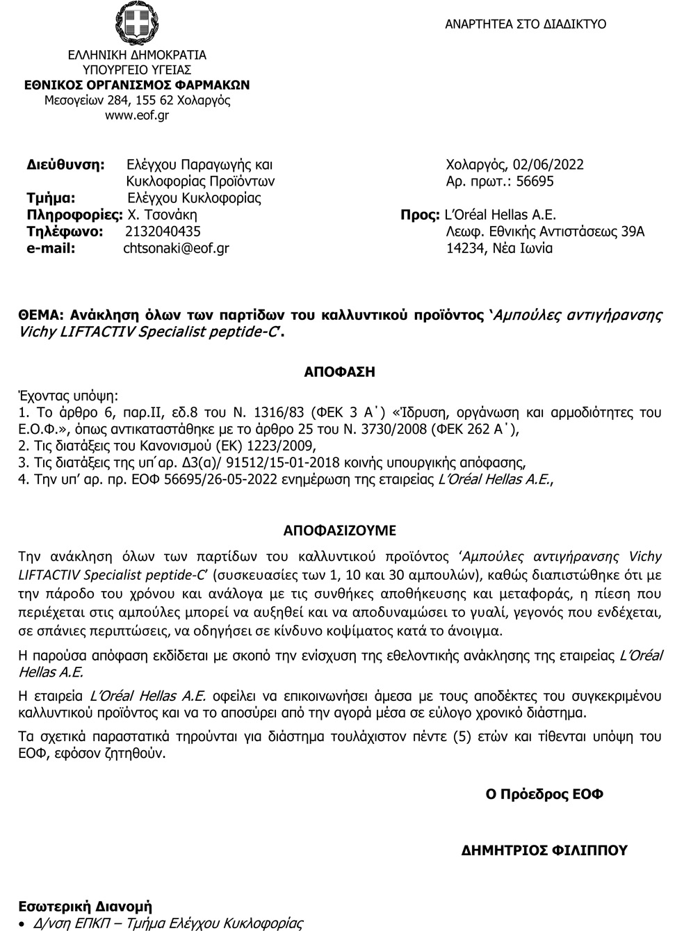 Την ανάκληση όλων των παρτίδων του καλλυντικού προϊόντος ‘Αμπούλες αντιγήρανσης Vichy LIFTACTIV Specialist peptide-C’ (συσκευασίες των 1, 10 και 30 αμπουλών), καθώς διαπιστώθηκε ότι με την πάροδο του χρόνου και ανάλογα με τις συνθήκες αποθήκευσης και μεταφοράς, η πίεση που περιέχεται στις αμπούλες μπορεί να αυξηθεί και να αποδυναμώσει το γυαλί, γεγονός που ενδέχεται, σε σπάνιες περιπτώσεις, να οδηγήσει σε κίνδυνο κοψίματος κατά το άνοιγμα.