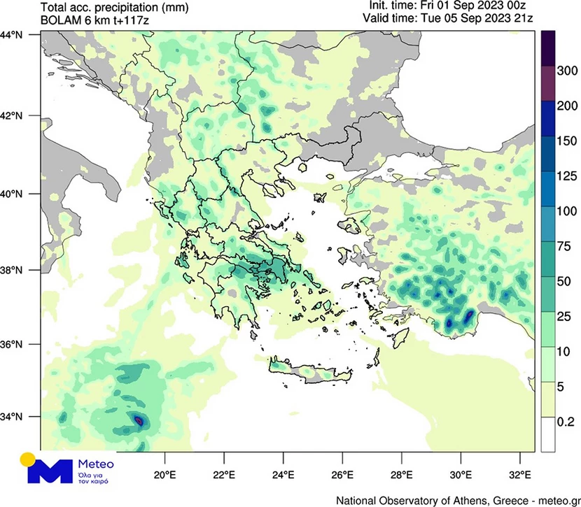 Κακοκαιρία που θα θυμίζει Οκτώβριο, ακόμη και Νοέμβριο αναμένεται από την αρχή της επόμενης εβδομάδας και εκτιμάται ότι θα επηρεάσει όλη τη χώρα. Από το συνολικό ύψος βροχής σε χιλιοστά που προβλέπει το αριθμητικό μοντέλο του Εθνικού Αστεροσκοπείου Αθηνών/meteo.gr μέχρι την Τρίτη 5/9, φαίνεται ότι η περιοχή του Έβρου θα είναι από τις ελάχιστες περιοχές της χώρας μας που δεν θα δεχθεί βροχοπτώσεις.