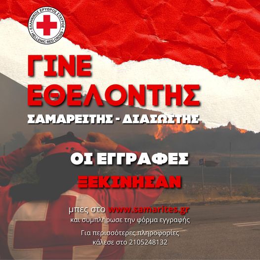 Ο Ελληνικός Ερυθρός Σταυρός ανακοινώνει την έναρξη της περιόδου εγγραφών νέων εθελοντών Σαμαρειτών-Διασωστών. Το πρόγραμμα εκπαίδευσης της Σχολής Σαμαρειτών-Διασωστών του Ε.Ε.Σ. είναι το πληρέστερο που υπάρχει στην χώρα μας, αναδεικνύοντας κάθε χρόνο εκατοντάδες νέους Εθελοντές Σαμαρείτες - Διασώστες σε όλη τη Ελλάδα, οι οποίοι είναι απόλυτα καταρτισμένοι για να αντιμετωπίσουν οποιαδήποτε έκτακτη κατάσταση προκύψει στο μέλλον.