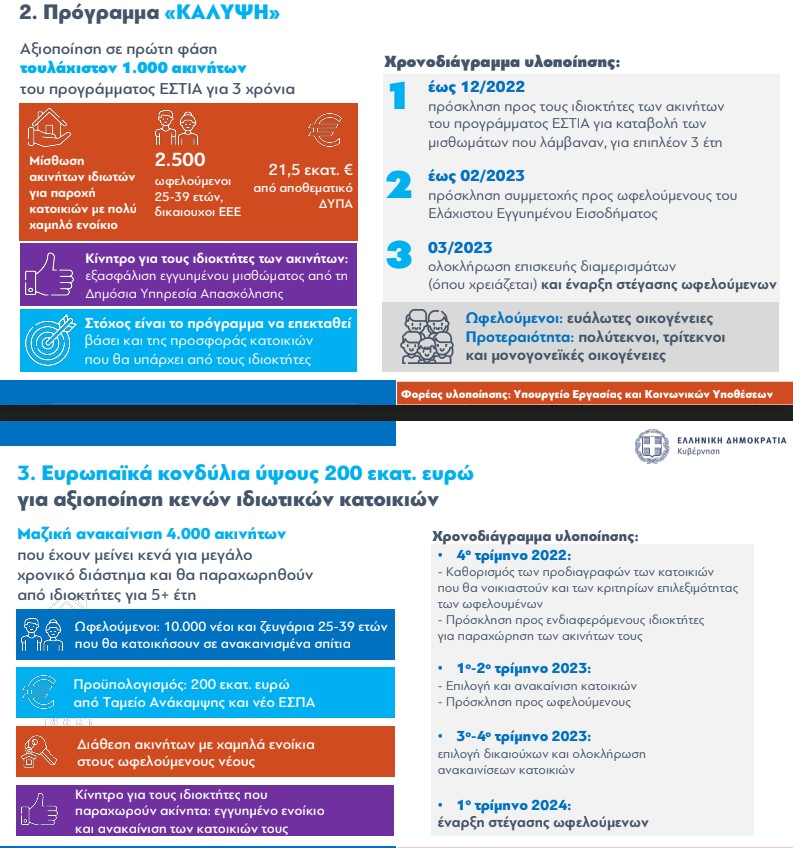 - Πρόγραμμα «Εστία»: Μέχρι το Δεκέμβριο θα δημοσιευθεί η πρόσκληση προς τους ιδιοκτήτες των ακινήτων του προγράμματος για καταβολή των μισθωμάτων που λάμβαναν, για επιπλέον 3 έτη. Θα ακολουθήσει (έως το Φεβρουάριο του 2023) η δημοσίευση της πρόσκλησης συμμετοχής προς τους ωφελούμενους.