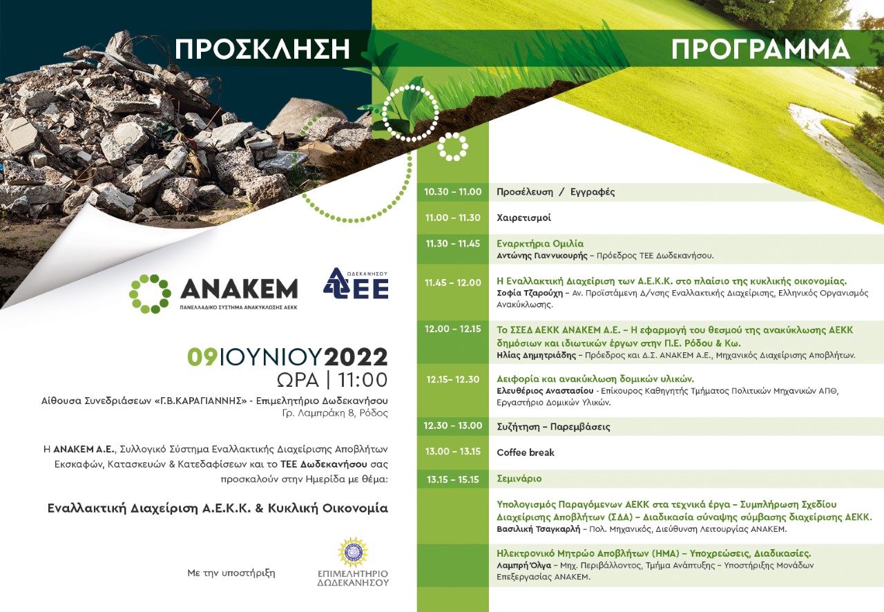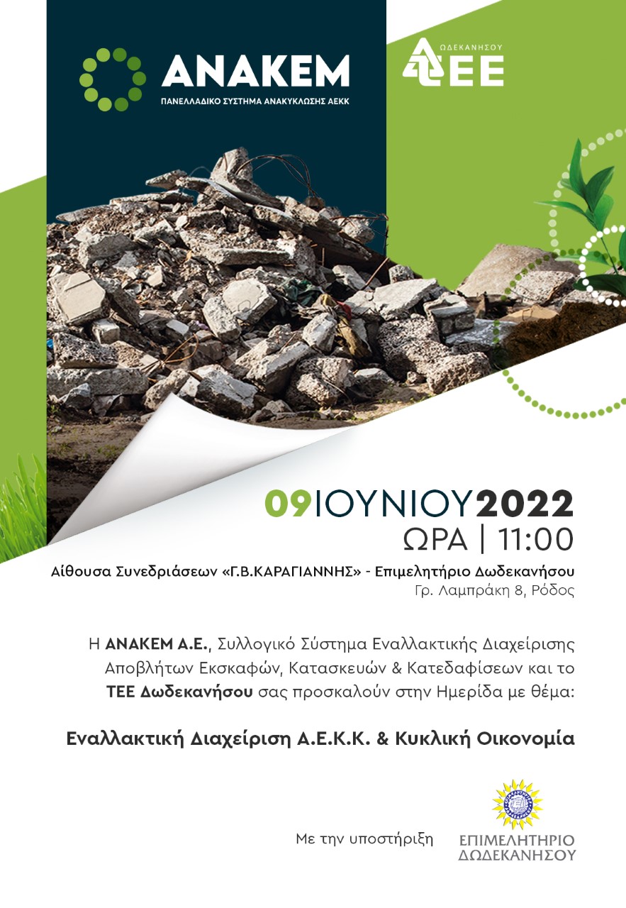 Ημερίδα με θέμα: «Εναλλακτική Διαχείριση Α.Ε.Κ.Κ. & Κυκλική Οικονομία» διοργανώνει η ΑΝΑΚΕΜ Α.Ε., σε συνεργασία με το ΤΕΕ Δωδεκανήσου.