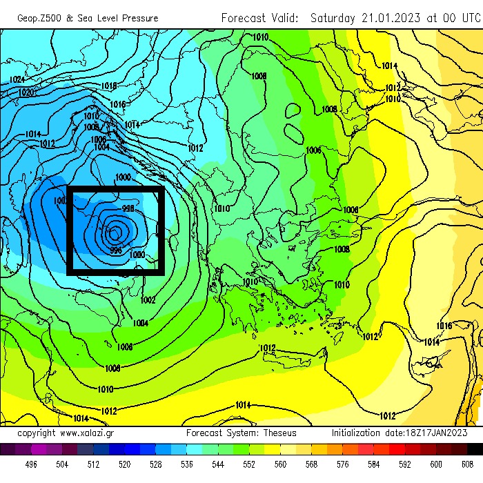 Στον πρώτο χάρτη μας επισημαίνουμε με ένα πλαίσιο την περιοχή όπου θα λάβει χώρα αυτή η εκρηκτική κυκλονογέννεση.