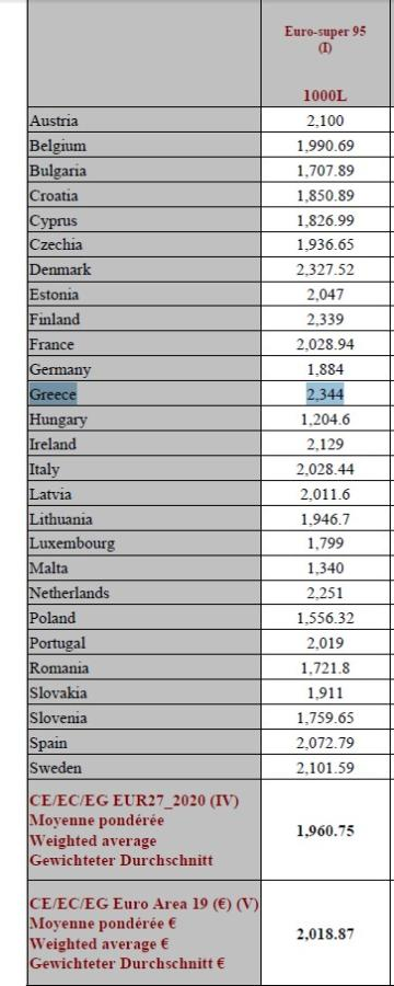 Όπως φαίνεται στον πίνακα από το Oil Bulletin της Ευρωπαϊκής Επιτροπής, με μέση τιμή 2,344 ευρώ το χιλιόλιτρο (2,34 ευρώ το λίτρο), η Ελλάδα έχει πλέον την ακριβότερη αμόλυβδη σε όλη την Ευρώπη.